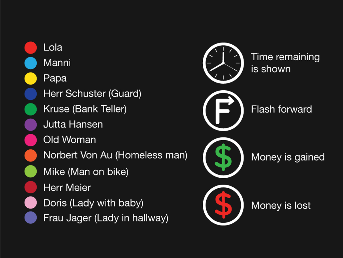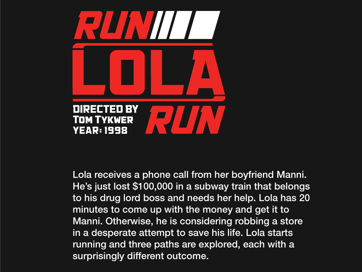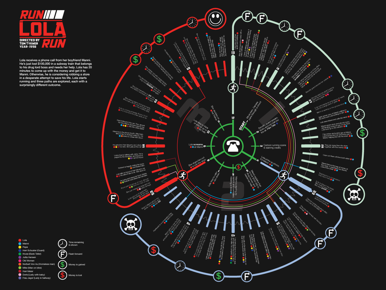 In this particular movie, the main character, Lola, has to come up with $100 000 in just 20 minutes to save her boyfriends life. She goes through a series of 3 different "runs", all with different outcomes depending on minor changes in events along the way. The structure for this diagram relies heavily on the symbolism of the clock used in the film, which is why I used a circular format divided into 3 main sections to represent the three 20 minute runs. The colours of the runs correlate to Lola's outfit in the film. The timeline starts at the center and moves clockwise around the circle, ending at the final outcome, depicted here as a smiley face icon.